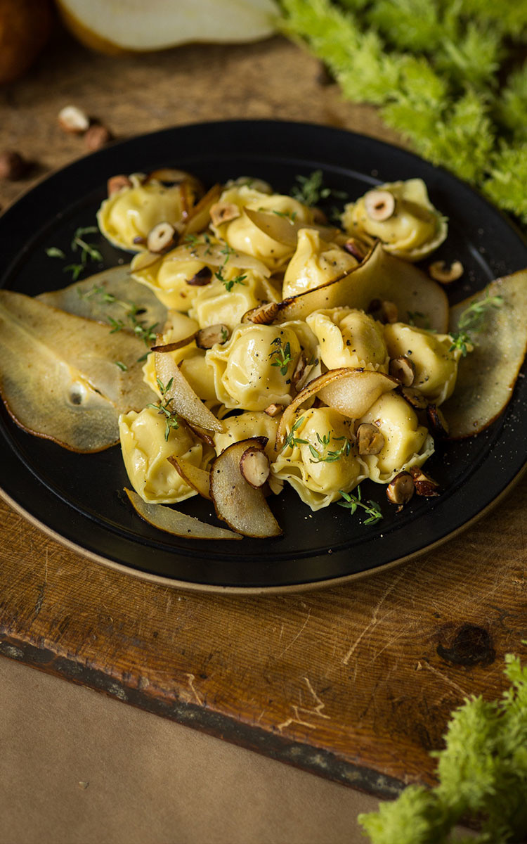 Tortellini Basil And Pine Nuts Pesto With Caramelized Pears Hazelnuts And Thyme Giovanni Rana